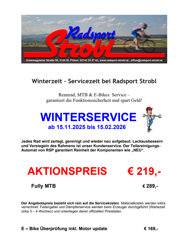 Wir verpassen Ihrem Fahrrad ein Service und machen es so bereit für die kommende Saison! Außerdem checken wir auf Anfrage, ob der Akku bei Ihrem E-Bike noch in Ordnung ist!